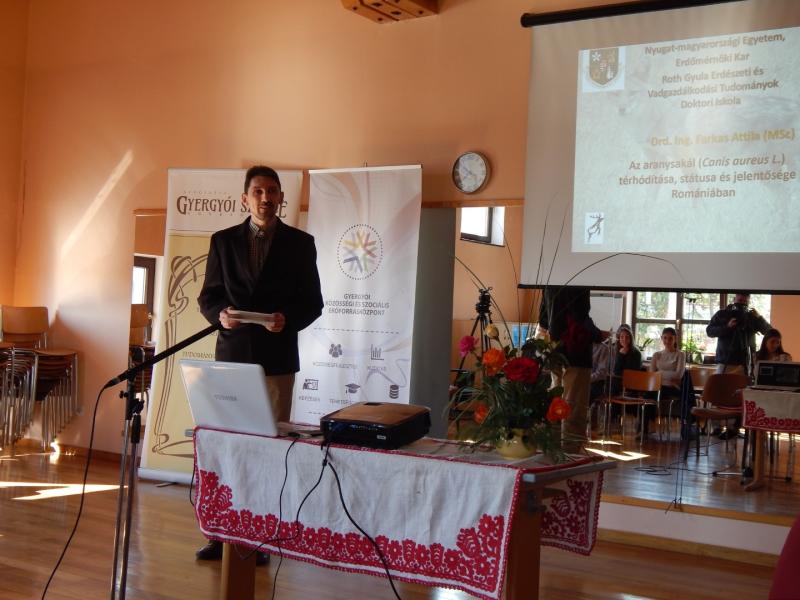 - drd. Farkas Attila (doktorandusz, Nyugat-magyarországi Egyetem, Erdőmérnöki Kar, Roth Gyula Erdészeti és Vadgazdálkodási Tudományok Doktori Iskola): Az aranysakál (Canis aureus L.) térhódítása, státusza és jelentősége Romániában (2gydk_farkas_attila.pptx (5.2 MB))